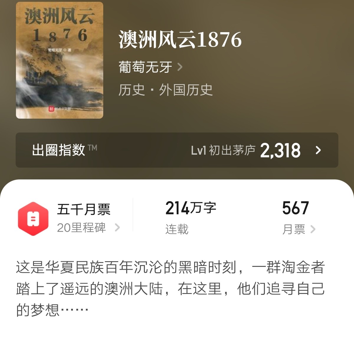 主角李福寿重生成为1876年一个到澳洲淘金者,开局利用三仙归洞的戏法赚取了第一桶金,后开饭店,搞连锁快餐迅速积累财富,之后收买人心,收集武器,一统澳洲,建立新的华人国家。