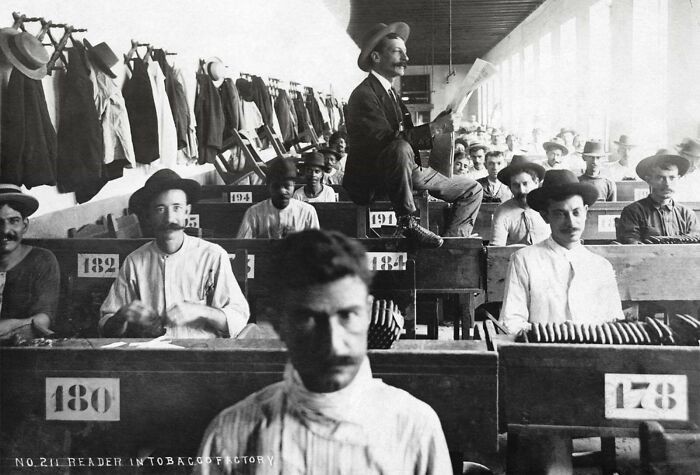 1900-1910年,因为当时的员工多为文盲。,一家古巴雪茄厂请了一位读者为工人读小说、诗歌、报纸等。
