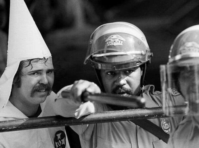 这是一张十分讽刺的照片。1983年,在德克萨斯州,一群3K党(白人至上主义)开集会被围攻。其中一名3K党成员躲到一名黑人警察后面寻求保护。