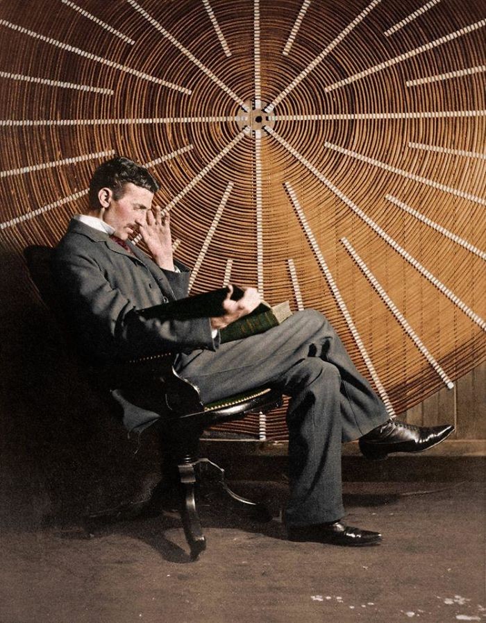 在纽约东休斯顿街,尼古拉·特斯拉坐在高频变压器的螺旋线圈前读书,他阅读的书籍是Theoria Philosophiae Naturalis。
