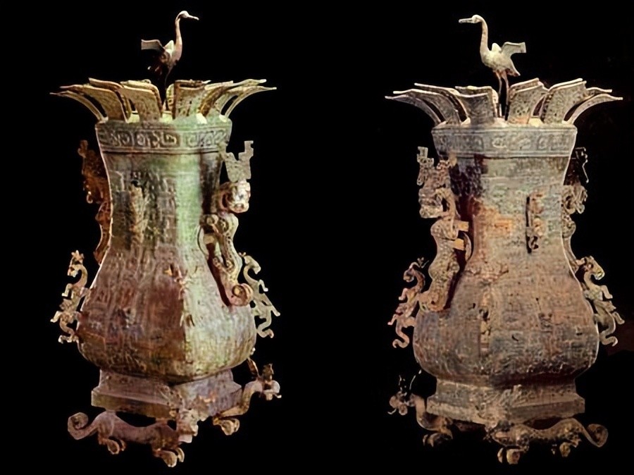 第五:春秋莲鹤方壶,春秋中期青铜制盛酒或盛水器,1923年出土于河南新郑李家楼郑公大墓,一收藏于北京故宫博物院青铜馆,一收藏于河南博物院,中国首批禁止出国(境)展览文物。此壶主体部分为西周后期以来流行的方壶造型,有盖、双耳、圈足,重心在下腹部,遍饰于器身上下的各种附加装饰,不仅造成异常瑰丽的装饰效果,而且反映了在春秋时期青铜器艺术审美观念的重要变化。