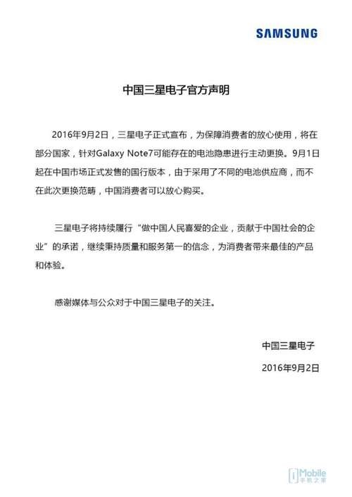 9月1号,三星正式出面道歉,确认了手机的电池存在质量缺陷,自燃就是因为电池出现问题而导致的,不过三星在这次道歉中提到了中国销售的NOTE7手机是另外一家工厂生产的电池,不会导致这个问题,所以国行NOTE7的销售不受影响