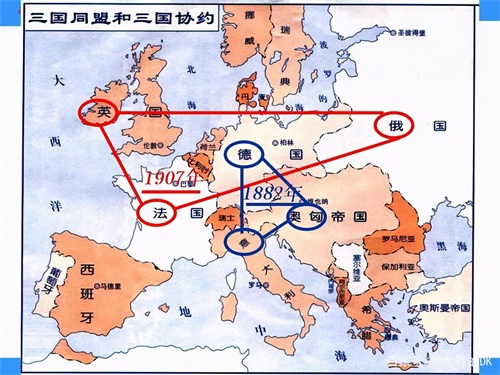 一战正式开始前,欧洲各大国之间就充满了矛盾:法德矛盾、俄奥矛盾、英德矛盾。矛盾之下,各国运用政治、外交手段建立各种同盟:德、奥、意三国同盟;俄、法、英三国协约。