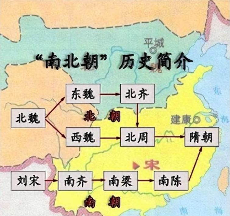 南朝(420-589)承自东晋,有南朝宋、南朝齐、南朝梁、南朝陈四朝,均以建康(今江苏南京)为都;北朝(439-581)承自十六国,有北魏、东魏、西魏、北齐和北周五朝,北魏分裂为东魏、西魏,北齐取代东魏,北周取代西魏,北周灭北齐。