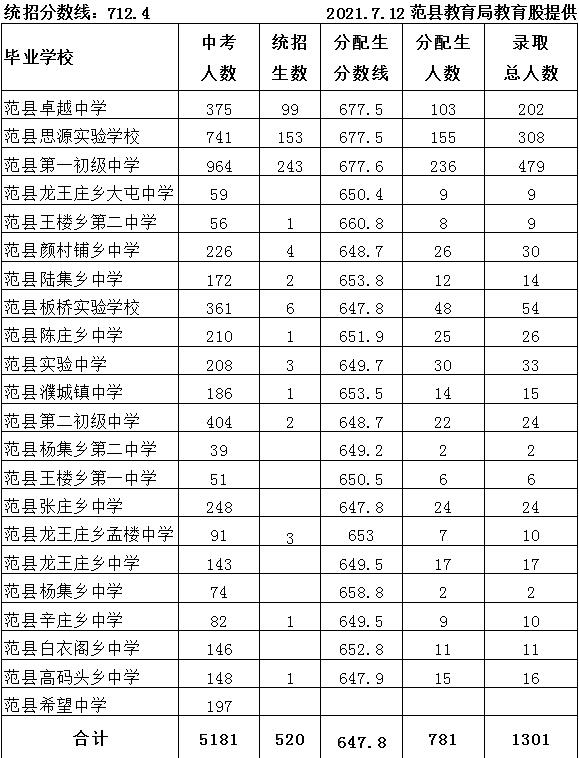 附:2021年范县一中高中招生统招及分配生一览表