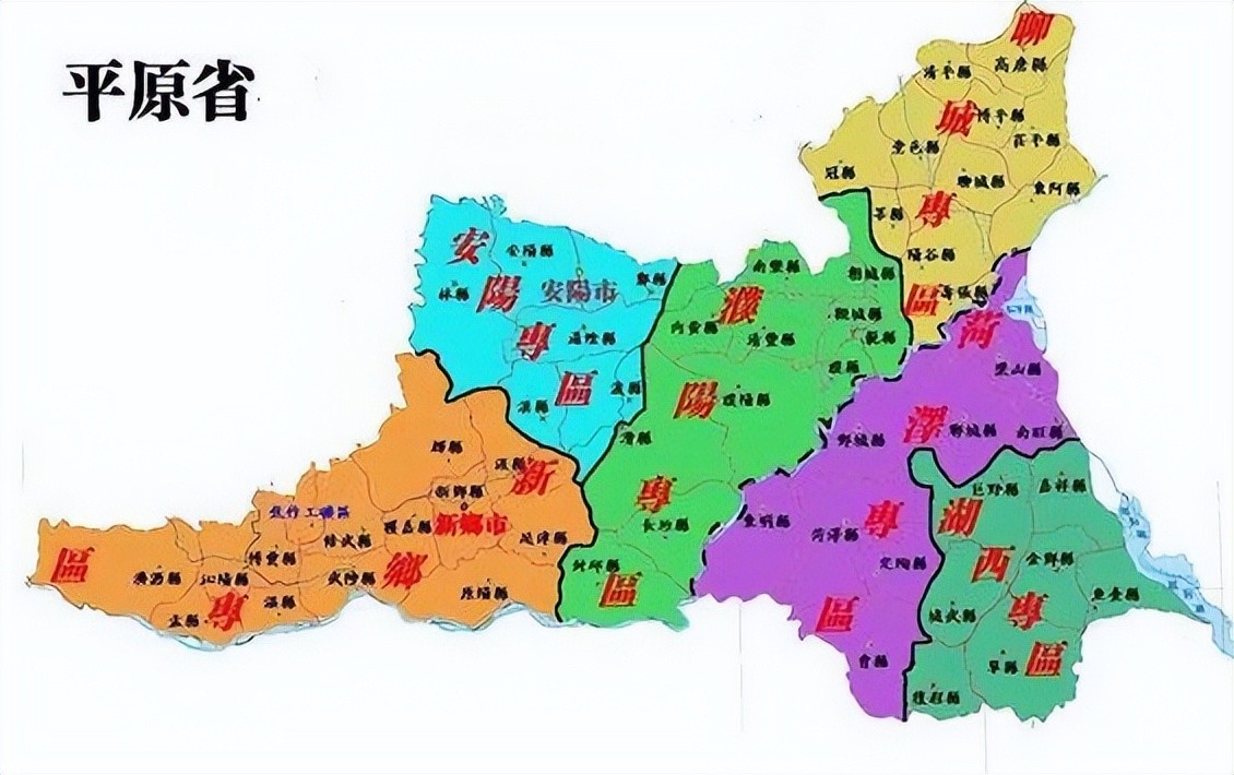 先属平原省原为山东省旧辖的高唐、清平、博平、荏平、聊城、堂邑、冠县、莘县、朝成、阳谷、东阿、梁山、寿张、范县、观城、濮县、鄄城、郓城、南旺、嘉祥、巨野、菏泽、定陶、城武、金乡、鱼台、单县、复城、曹县等29县,全部划归山东省属;原为河南省旧辖的林县、安阳、邺县、内黄、汤阴、浚县、滑县、淇县、汲县、辉县、新乡、延津、封丘、原阳、获嘉、修武、武陟、博爱、温县、沁阳、孟县、济源等22县,新乡、安阳两市及焦作矿区,全部划回河南省;原河北省旧辖之南乐、清丰、濮阳、东明、长垣等5县,为治黄之便,亦划归河南属,不再划回河北省;现属河北省原为河南旧辖的武安、涉县、临漳三县不动,仍属河北省,以利治漳。