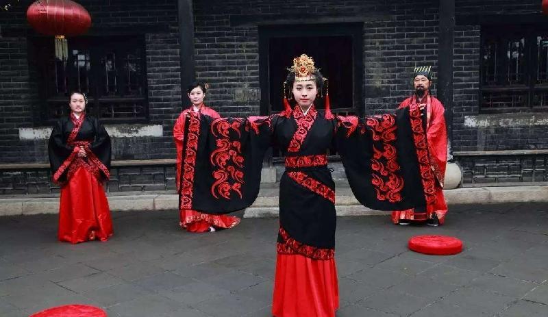 “二加”,正宾高声吟诵:“吉月令辰,乃申尔服。敬尔威仪,淑慎尔德。眉寿万年,永受胡福”。赞者为及笄者去发笈,正宾为及笄者簪上发钗,及笄者回到东房换上曲裾深衣。曲裾深衣,是最能体现女子之美,象征着花季少女的明艳美丽。