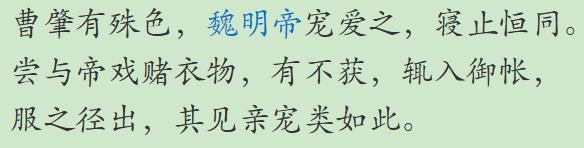 魏明帝曹睿对他甚是宠爱,曹肇和曹叡两个人经常厮混在一起,形影不离,甚至是同榻而眠、同衾而卧,就是钻一个被窝。两个人经常追逐打闹、嘻嘻笑笑,在王宫里面追追追。有一次他们两个人打赌,曹叡输了,输了的人得脱衣服,曹肇一跃钻进皇帝的御帐。