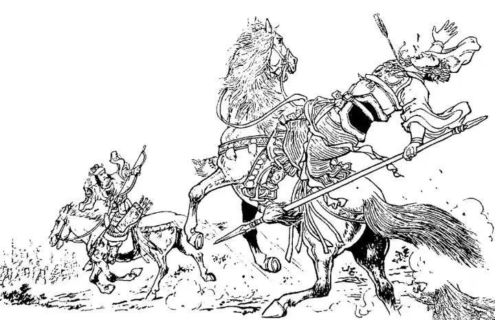 他把十个缨骨朵挂在枪上,插在百步之外。只见他一偏身子跳上“雪花豹”,校场上顿时尘土飞扬,小养由基拈弓搭箭,偏过脸儿,“飕”射出了第一支箭。