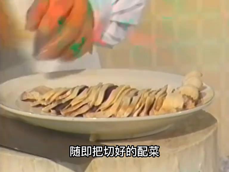 ·配菜笋、火腿也是切片处理。随即把切好的配菜依次铺在熊片上面,盖上抹布后再盖上一个碗,是为了将熊掌翻转过来时呈配菜在下,熊掌再上的形状。