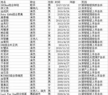韩国娱乐圈很残忍无情,明星自杀率居高不下,甚至喻演喻烈,民星的不幸遭遇之灾,看看下面这张表格,就不难知道许多年轻民星的遭遇是什么原因了。