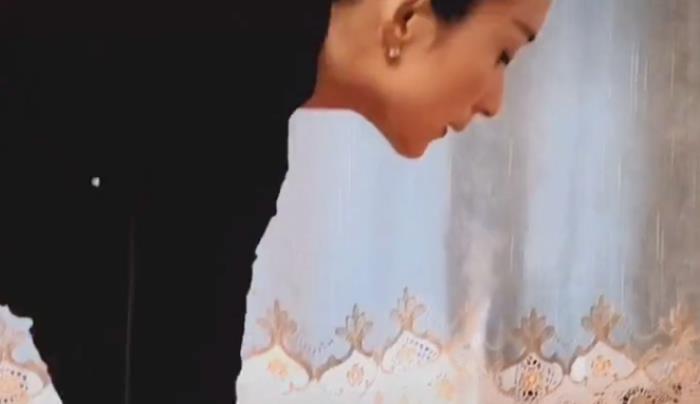 几个侧面的镜头也不难看出,汤灿的脸部曲线依旧完美。下巴尖尖的,眉眼之间还有一些妩媚。