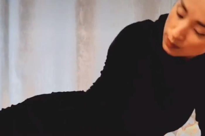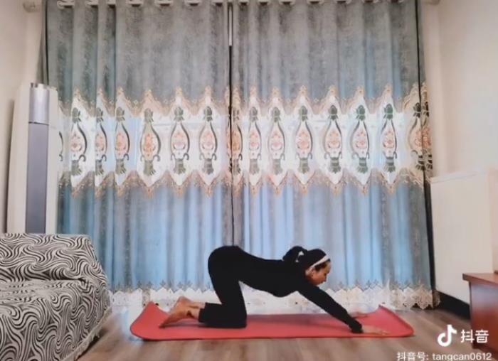 然后镜头一转,就看见汤灿在家里的瑜伽垫上,又是踢腿又是下腰的,动作非常标准。