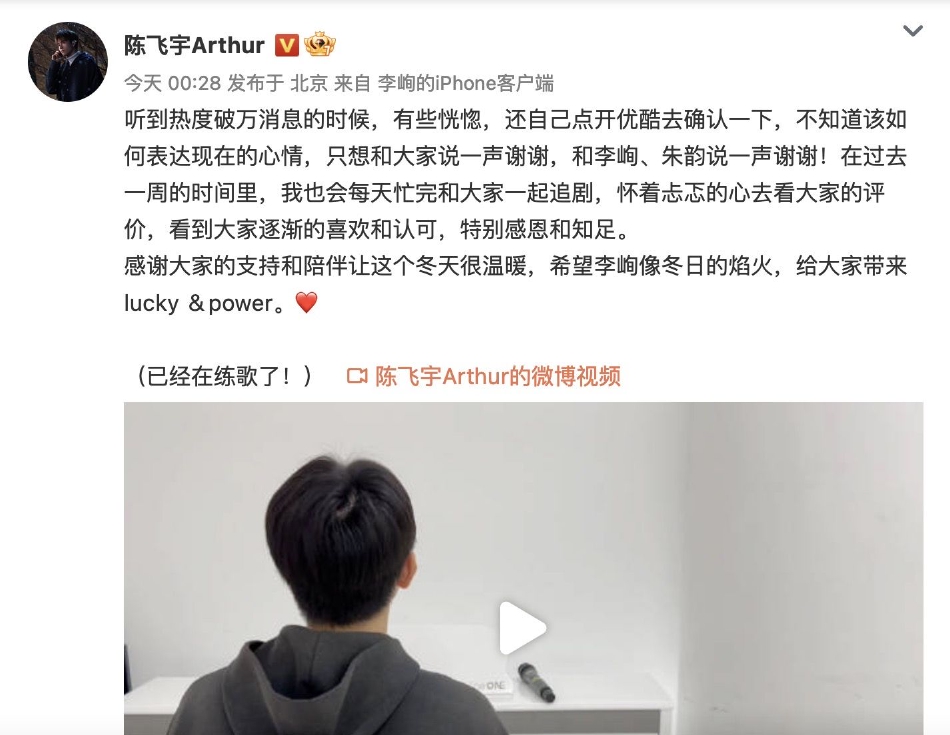 原标题:新剧热度破万陈飞宇发博感谢 希望给大家带来lucky &power