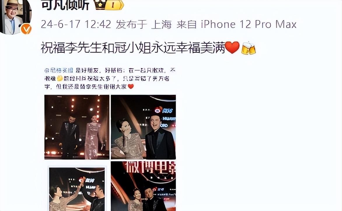 当得知王冠在“2024微博电影之夜”宣布与“李先生”的感情时,曹可凡第一时间在社交媒体上发布了一条简短而真诚的祝福:“祝贺王冠找到她的幸福!”这句话不仅仅是一句祝福,它背后承载了更多的意义和情感。