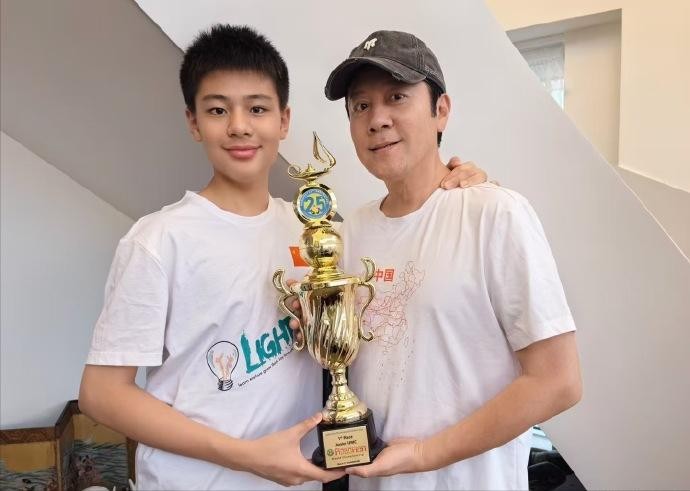 两人捧着一个奖杯,应该是庆庆有获奖了,虽然庆庆的外表赶不上父亲,但是能力确实一点都不差。