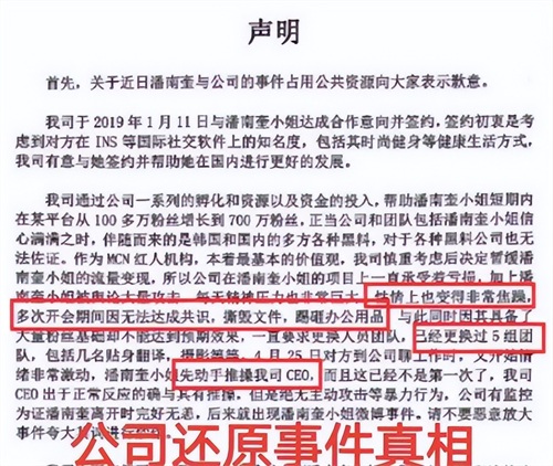 眼见潘南奎占尽舆论上风,经纪公司这边也坐不住了,他们在声明中讲述了前因后果,跟潘南奎的说法完全是两个版本。