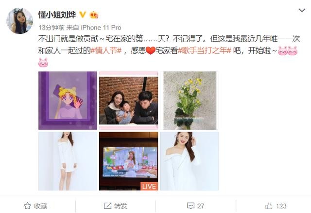 2月14日情人节当天,芒果台新一姐花旦刘烨在网上晒照分享心情,她称在家已经不知道宅了多少天了,不出门就是做贡献,虽然只能宅在家中,但这也是她最近几年唯一一次和家人一起过的情人节。