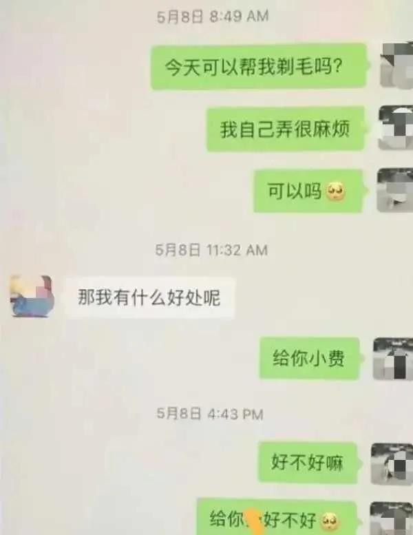 从信息截图上看到,妻子与情人的对话内容画面感让人惊讶!妻子居然要求情人给她修剪毛发,而情人无耻地问有什么好处,妻子的回答已经不适合写出来了。