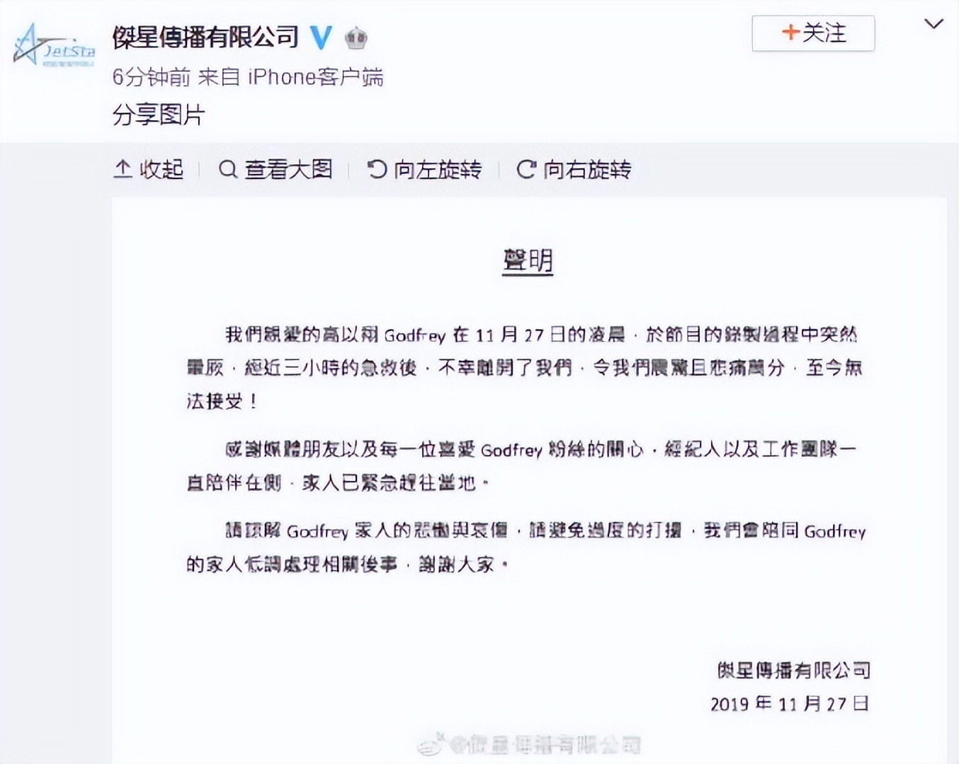 在2019年高以翔参加了节目《追我吧》,听名字就知道是一档运动节目,高以翔在节目录制的时候晕倒,等到送往医院的时候就已经瞳孔放大了。