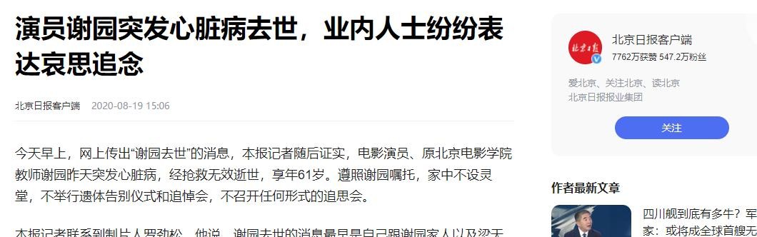 演员谢园突发心脏病去世,业内人士纷纷表达哀思追念-北京日报客户端