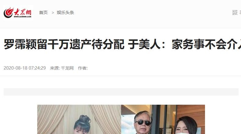 罗霈颖留千万遗产待分配 于美人:家务事不会介入_娱乐头条_大众网