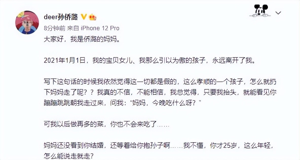 不少粉丝表示孙侨潞就是她们“看着长大”的,谁知道在2021年1月2日,孙侨潞的母亲在她的账号发布了讣告,证实孙侨潞离开了人世。