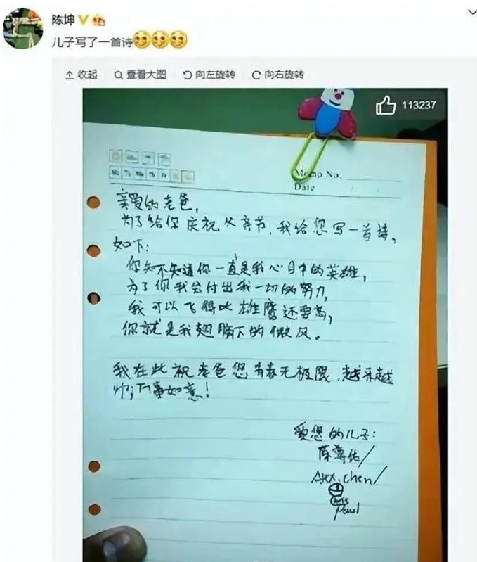 但是对于孩子的成长确实十分高调,2015年的父亲节上,他将孩子陈尊佑为他写得诗歌,高调晒在社交平台上,并配文到:儿子写了一首诗,言语之间尽是开心与得意。