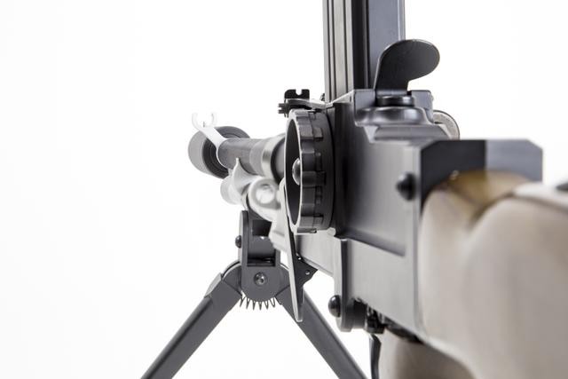 拉机柄位于枪身右侧,射击时不随动。枪管有散热片,枪口有喇叭状消焰器,上面有小孔。枪托有托肩板和底套,内有缓冲簧。可伸缩式两脚架可,枪管有小提把,搬开插销就能更换枪管。
