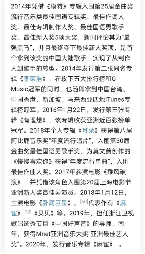没想到吧?奖项荣誉就这么点。周杰伦就不提了,写不完。下面看看李荣浩的