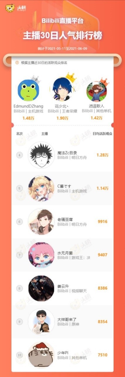 B站主播人气TOP10:歌手姜云升跻身前十,成新晋人气黑马