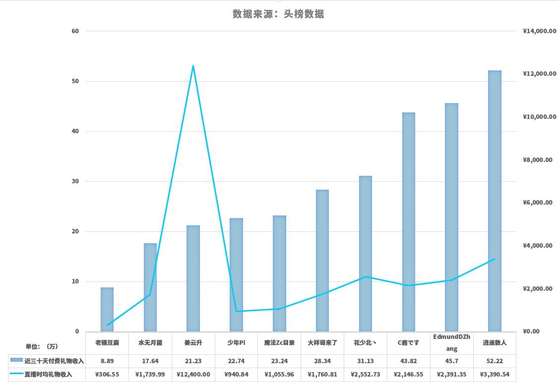 在近三十天的收入数据显示,姜云升的总礼物营收是21万元,在十位主播中排行第七位,但他的直播每小时平均收入却高达1.27万元,处于十位主播之首,这正是其歌迷铁粉战斗力强的表现论证。