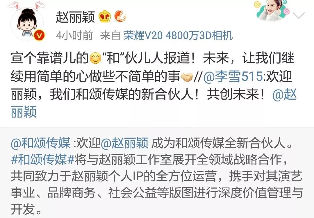 终于,和颂传媒的官方微博发文,宣布赵丽颖即将以合伙人的身份加入和颂传媒,和颂传媒将在演艺事业、品牌商务和社会公益等领域与赵丽颖展开深度合作。