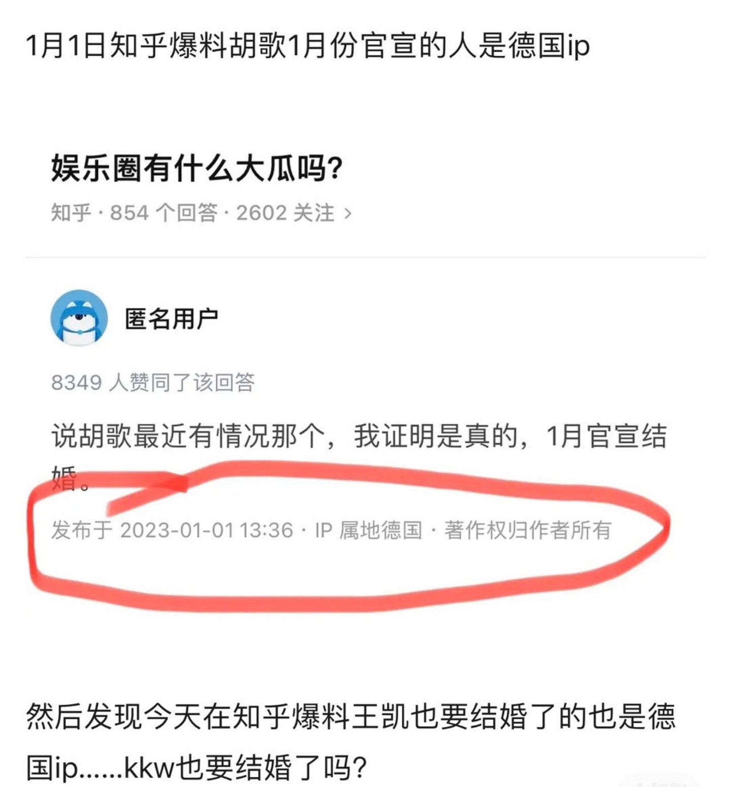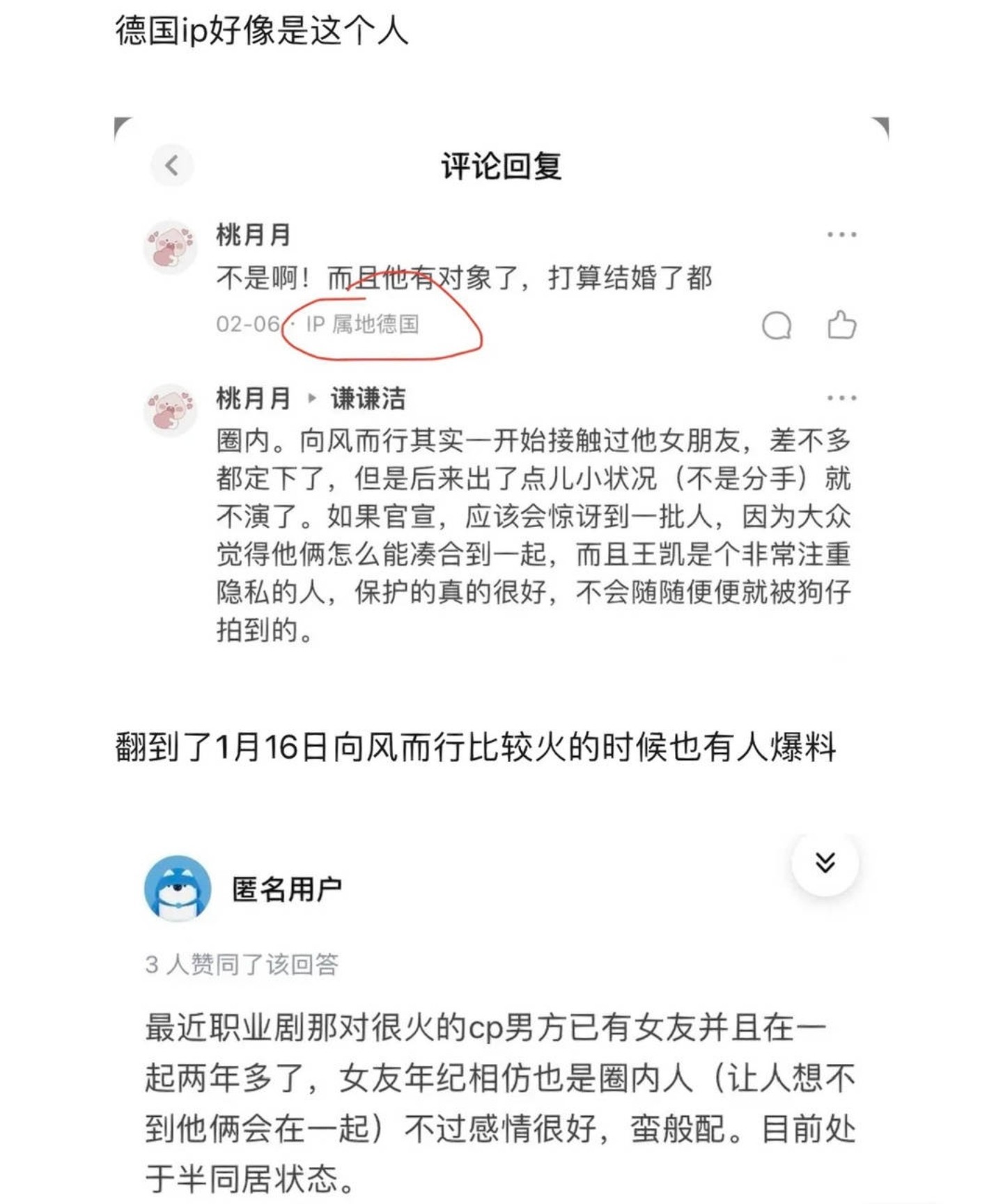 回到王凯这里,这次同样是在德国IP的匿名用户,同样是发布了好消息,说王凯也准备结婚了,女方还是圈内的人!