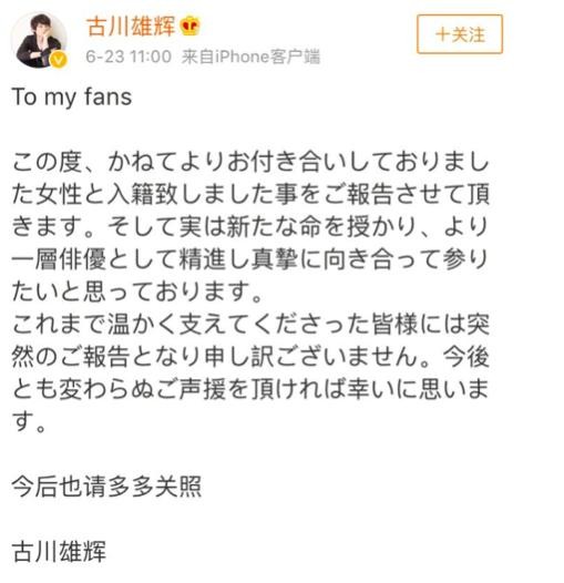 6月23日,古川雄辉通过个人微博发布了一条自己的婚讯,正式宣布结婚。