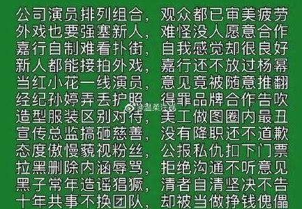 根据网友的描述,杨幂因为人气太高,所以公司会强行给她安排与一些新人合作,以便能够把公司签约的新人给带红,但是这样做的后果就是一直在消耗杨幂的人气,对于杨幂本人的发展也没有太大的好处,除此之外粉丝还列举种种嘉行的“罪行”:态度傲慢藐视粉丝,公报私仇扣下门票;拉黑删除内涵辱骂,拒绝沟通不听意见……