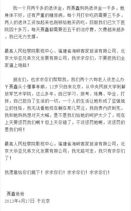 在最悲痛无助的绝望之下,聂鑫的父亲在2013年4月17日,通过聂鑫的社交账号发布了一篇文章。