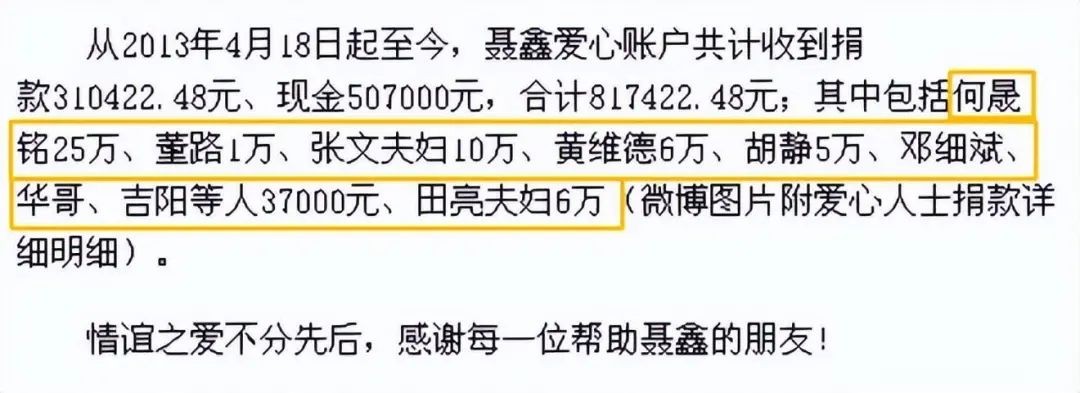 其中包括何晟铭捐了25万,董路捐了1万,张文夫妇捐了10万,黄维德捐了6万,胡静捐了5万,邓细斌、华哥、吉阳等人捐了37000元,田亮夫妇捐了6万等等。