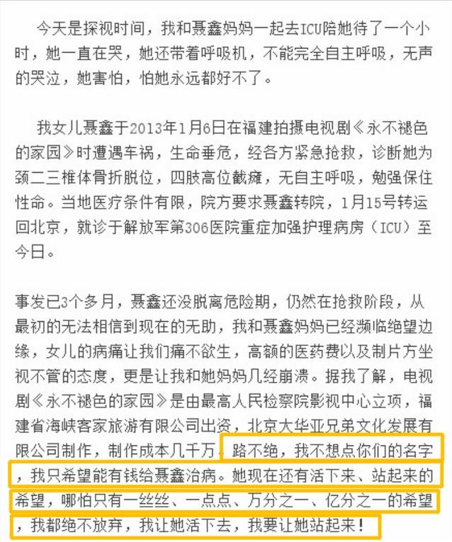 他们共同呼吁剧组和片方要承担相应的责任,去提供补偿资金帮助聂鑫继续治疗。