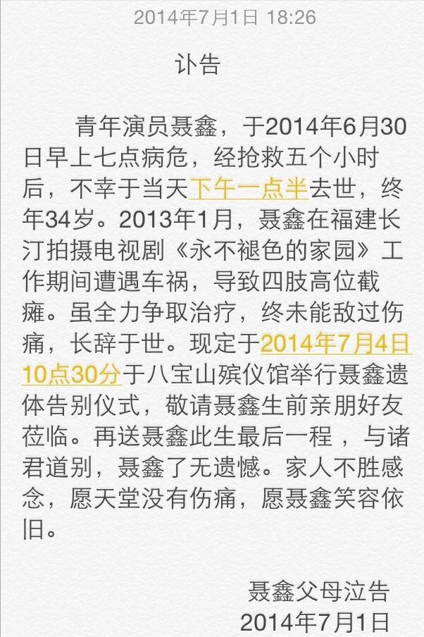 2014年6月30日,聂鑫在经过长达一年半的治疗后,最终还是遗憾离开了人世。
