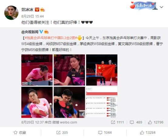 范冰冰最新一条微博,发在昨天,内容是为残奥会中国乒乓球队加油。
