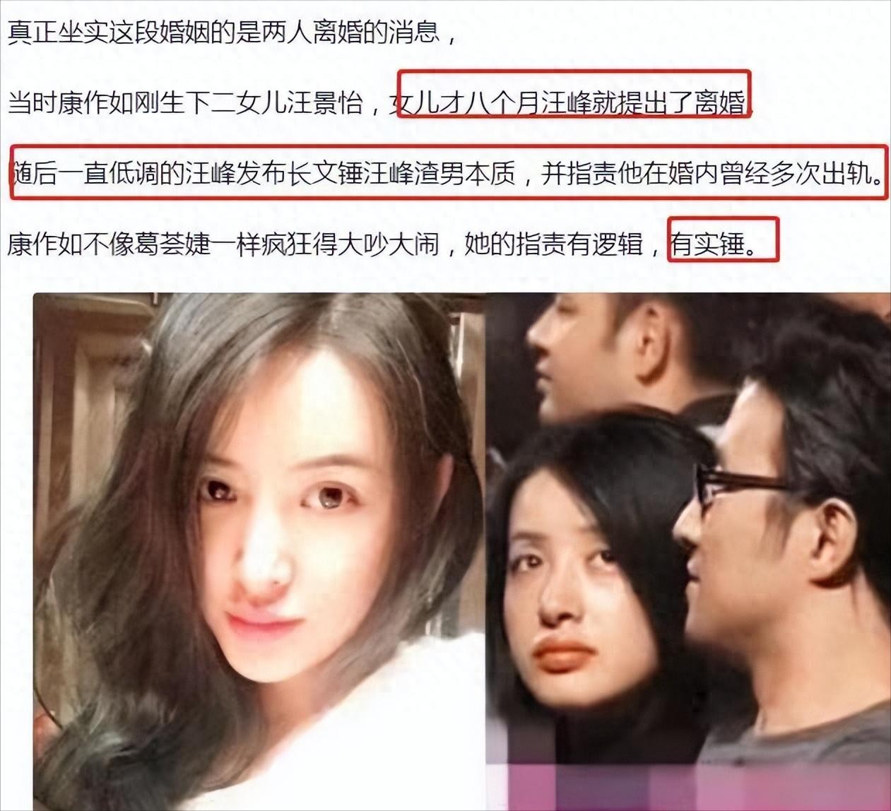 在葛荟婕之后,康作如又成了汪峰的新欢,两人甚至闪电结婚。然而好景不长,生完女儿后没几个月,康作如就被汪峰提出离婚。