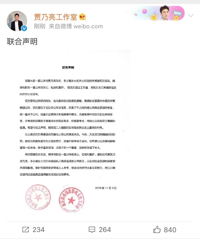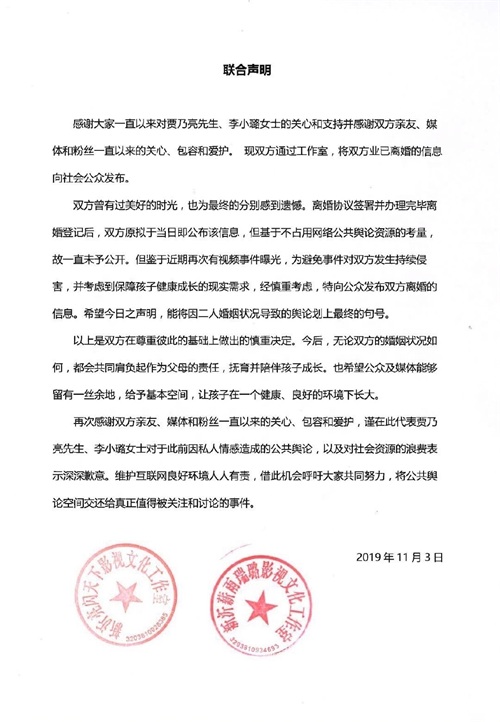 贾乃亮、李小璐双方发布联合声明,宣布两人已签署离婚协议并办理完离婚登记,并称这是双方在尊重彼此的基础上做出的慎重决定,两人七年的婚姻正式画下句点。