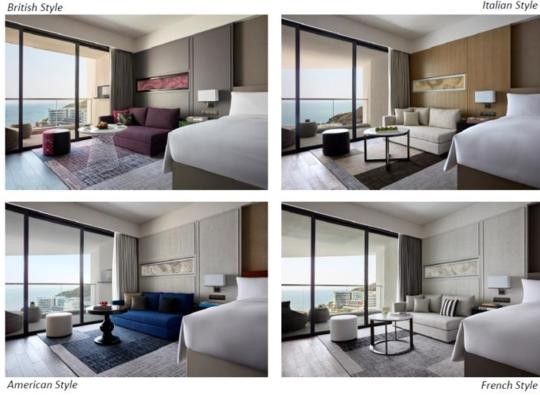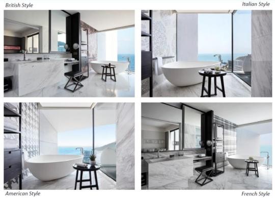 房间的设计分为各类主题,有小清新,也有繁复,还有理想简约,不过都与海洋元素离不开,时刻提醒住客这里是海边度假酒店,几乎所有的房间与卫生间由一扇巨大的推拉门隔开。