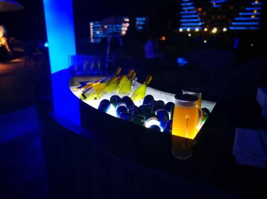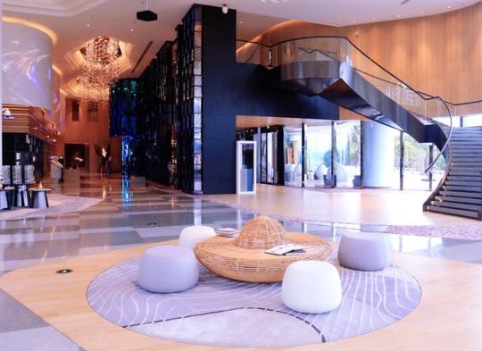 如果碰到用晚餐时,夜幕降临,类似海水的波纹状蓝色灯光照亮整个酒店外观,整个酒店的灯光让酒店的时尚份儿大增。