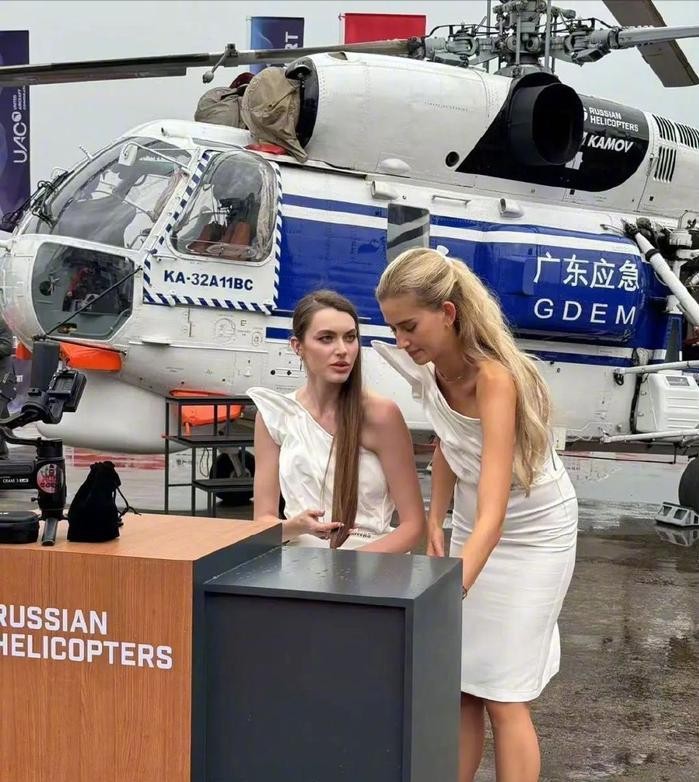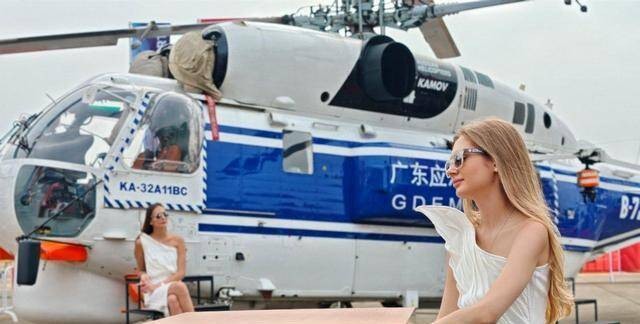 车展上有车模,航展自然也不能免俗。2024珠海航展,个别型号的飞机展出时,就有国外的美女“作陪”,卡-32就是其中之一。