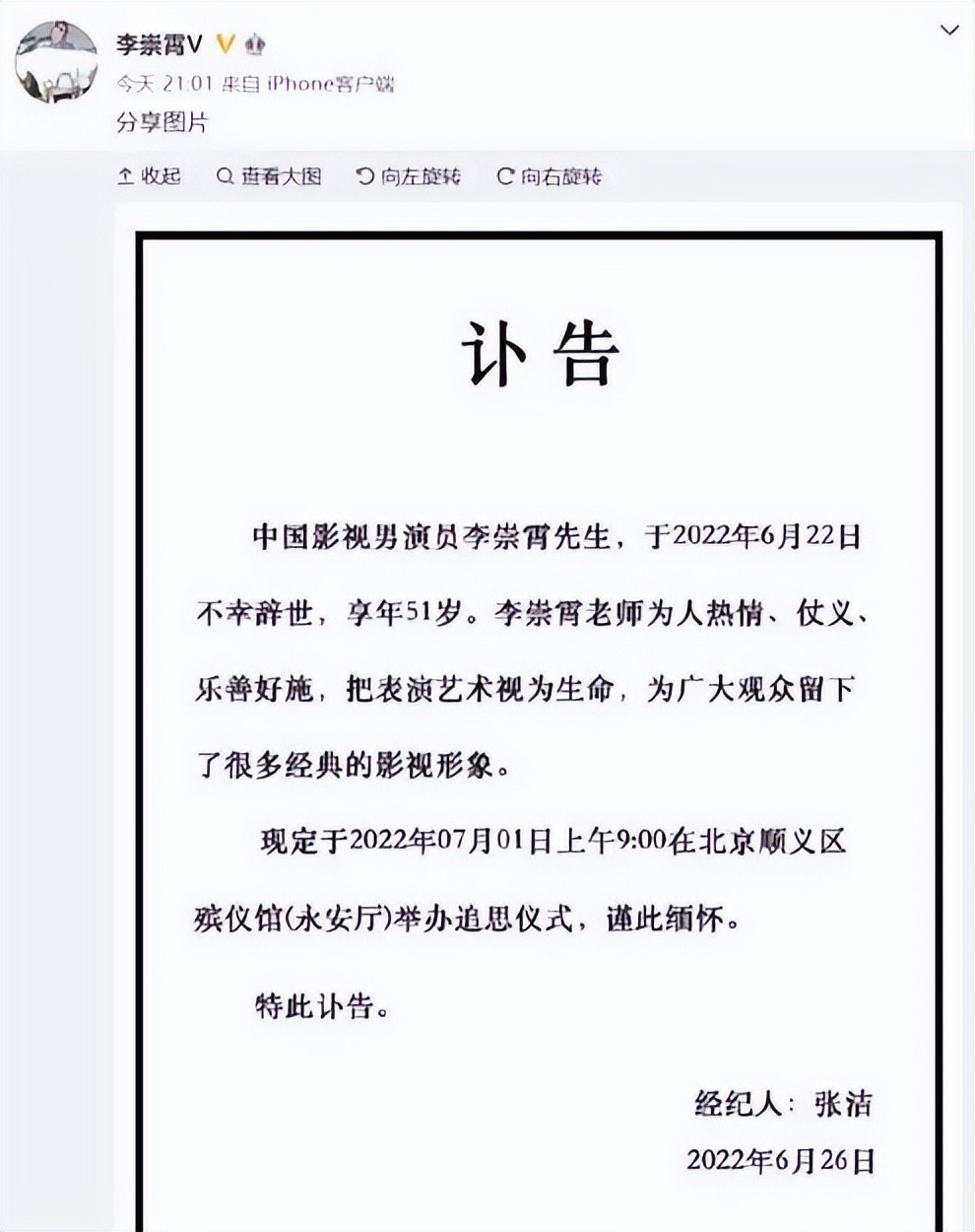 51岁演员李崇霄去世,生前最后一条动态曝光,女儿的卜告令人泪目