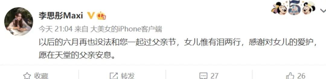李崇霄女儿还发了一条动态,以后再也不能陪您过父亲节了,看完很伤感。