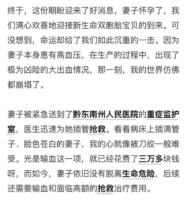不久之后,吴霜的丈夫在网上寻求帮助,称医生在抢救吴霜的过程中,光是输血就已经花费3万元,如今已无力承担后续的高额治疗费用,只能向广大的网友寻求帮助。