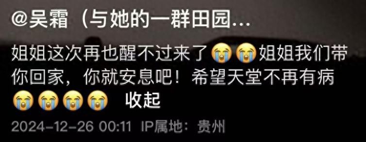 12月26日,美女网红“吴霜”的账号突然发布了一条视频, 其家人悲痛告知所有粉丝和网友,吴霜因大出血不幸去世,年仅41岁。